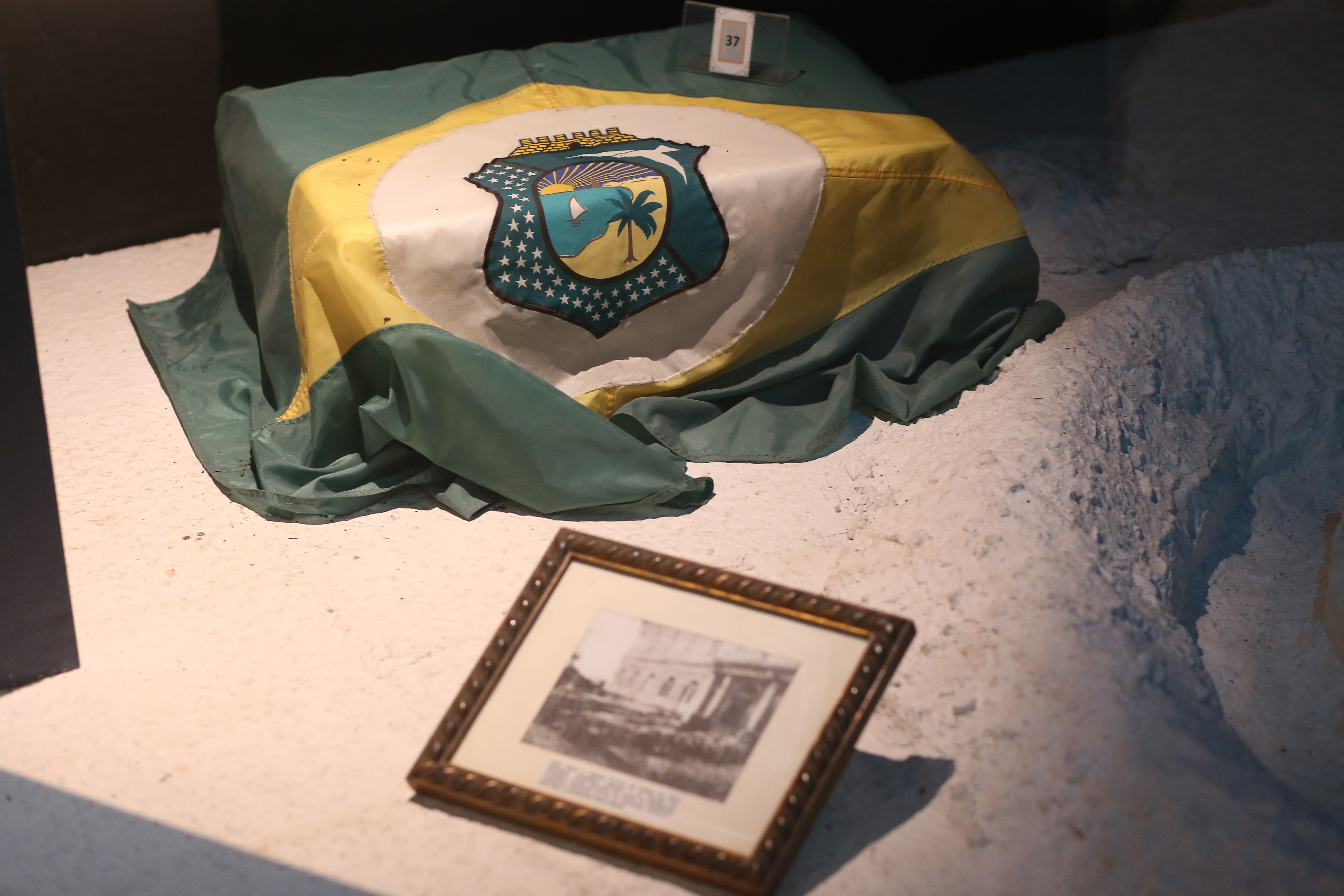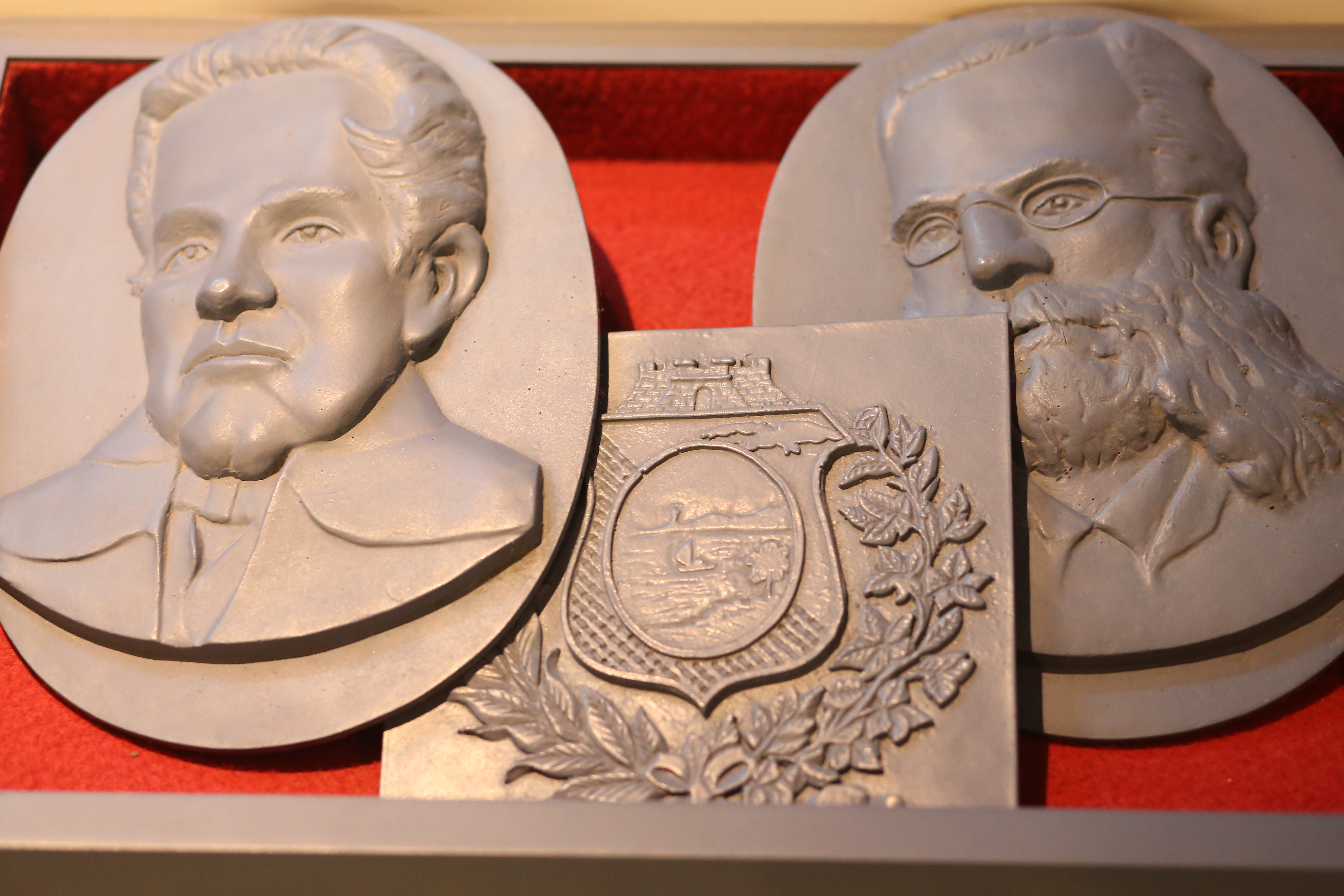 Objetos táteis, da esquerda para a direita: imagens de José Martiniano de Alencar, do brasão do Ceará e do engenheiro da Província Adolfo Hebster
