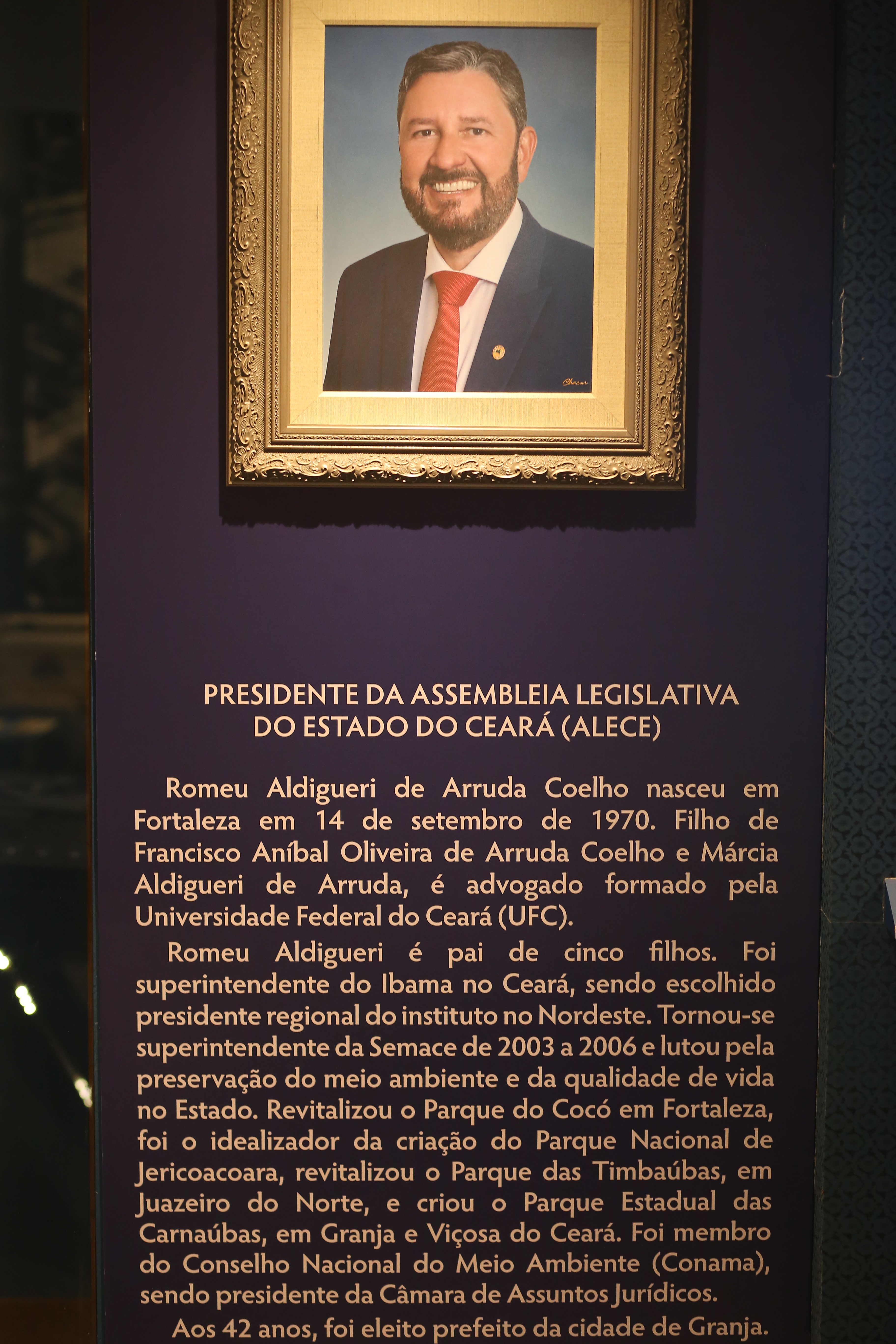 Painel do presidente da Alece, trazendo o perfil biográfico do atual presidente da Casa, deputado Romeu Aldigueri